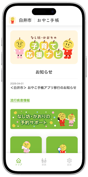 また 既存機能として、白井市からのお知らせを月齢・年齢にあわせてタイムリーに受信できる「メール配信・プッシュ通知機能」、予防接種漏れや接種間隔ミスを防ぐことができる「予防接種スケジューラー」、成長グラフや乳幼児健診の記録など母子手帳の内容をマイページに記録できる「電子母子健康手帳 機能」なども 引き続きご利用いただけます。