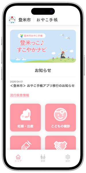また 既存機能として、登米市からのお知らせを月齢・年齢にあわせてタイムリーに受信できる「メール配信・プッシュ通知機能」、予防接種漏れや接種間隔ミスを防ぐことができる「予防接種スケジューラー」、成長グラフや乳幼児健診の記録など母子手帳の内容をマイページに記録できる「電子母子健康手帳 機能」なども 引き続きご利用いただけます。